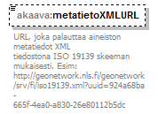 | source | <xs:element name="metatietoURL" type="xs:string" minOccurs="0"> <xs:annotation> <xs:documentation>URL www-sivulle, josta aineiston metatiedot ovat luettavissa ”selkokielisenä”. Esim: http://www.paikkatietoikkuna.fi/web/fi/paikkatietoaineisto?inspireMetadat aUIID=924a68ba-665f-4ea0-a830-26e80112b5dc</xs:documentation> </xs:annotation> </xs:element> |
