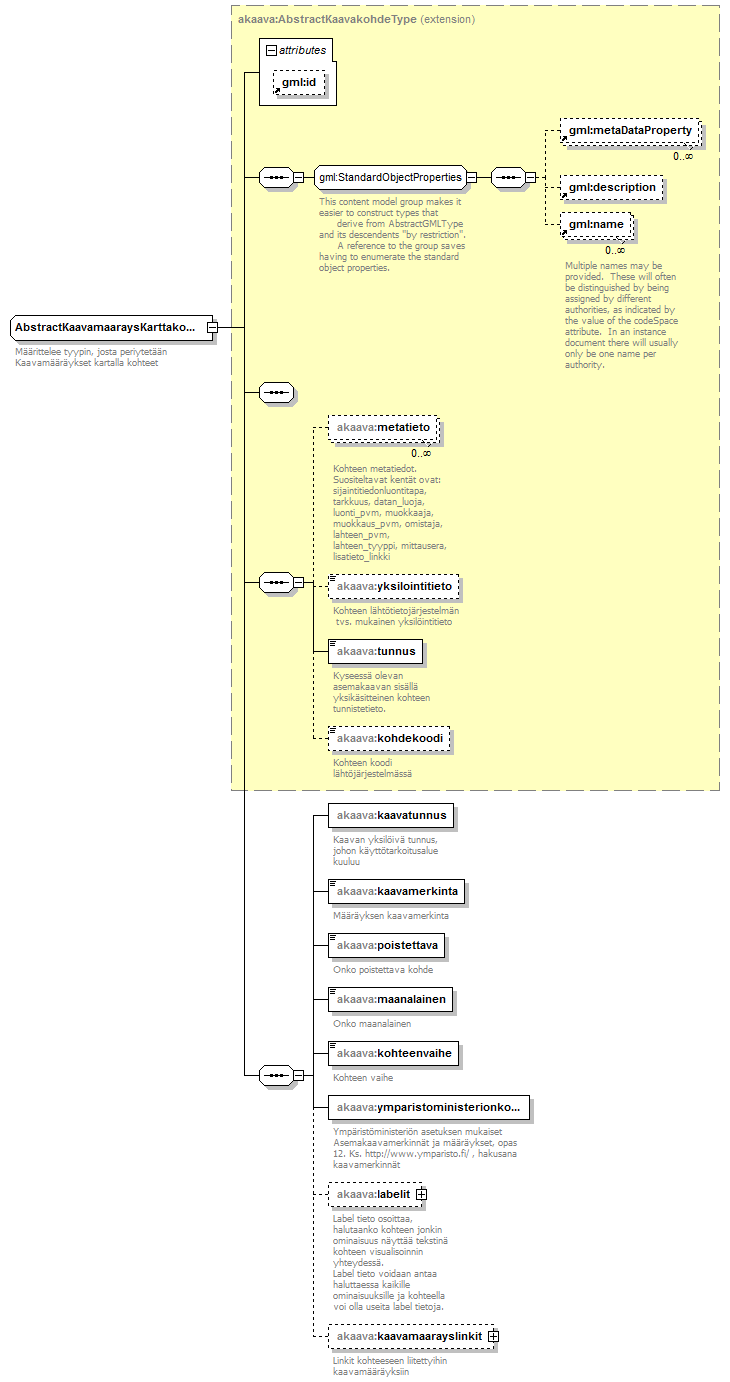| children | gml:metaDataProperty gml:description gml:name akaava:metatieto akaava:yksilointitieto akaava:tunnus akaava:kohdekoodi akaava:kaavatunnus akaava:kaavamerkinta akaava:poistettava akaava:maanalainen akaava:kohteenvaihe akaava:ymparistoministerionkoodi akaava:labelit akaava:kaavamaarayslinkit | ||||||||||||