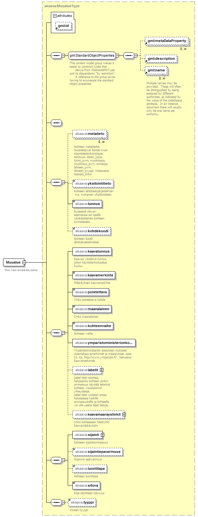 | children | gml:metaDataProperty gml:description gml:name akaava:metatieto akaava:yksilointitieto akaava:tunnus akaava:kohdekoodi akaava:kaavatunnus akaava:kaavamerkinta akaava:poistettava akaava:maanalainen akaava:kohteenvaihe akaava:ymparistoministerionkoodi akaava:labelit akaava:kaavamaarayslinkit akaava:sijainti akaava:sijaintiepavarmuus akaava:luontitapa akaava:sitova akaava:tyyppi | ||||||||||||