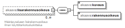 | source | <xs:element name="lisarakennusoikeus" minOccurs="0" maxOccurs="unbounded"> <xs:annotation> <xs:documentation>Määräaysalueen lisärakennusoikeus ilman käyttötarkoitusluokittelua</xs:documentation> </xs:annotation> <xs:complexType> <xs:sequence> <xs:element name="kuvaus" type="xs:string"/> <xs:element name="rakennusoikeus" type="xs:integer" nillable="true"/> </xs:sequence> </xs:complexType> </xs:element> |