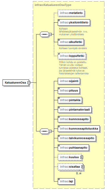 | children | infrao:metatieto infrao:yksilointitieto infrao:alkuHetki infrao:loppuHetki infrao:sijainti infrao:pituus infrao:pintaAla infrao:pintamateriaali infrao:kunnossapito infrao:kunnossapitoluokka infrao:talvikunnossapito infrao:puhtaanapito infrao:kuuluu infrao:sisaltaa infrao:laji | ||||