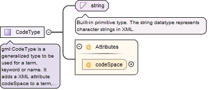 gml:CodeType is a generalized type to be used for a term, keyword or name.It adds a XML attribute codeSpace to a term, where the value of the codeSpace attribute (if present) shall indicate a dictionary, thesaurus, classification scheme, authority, or pattern for the term.