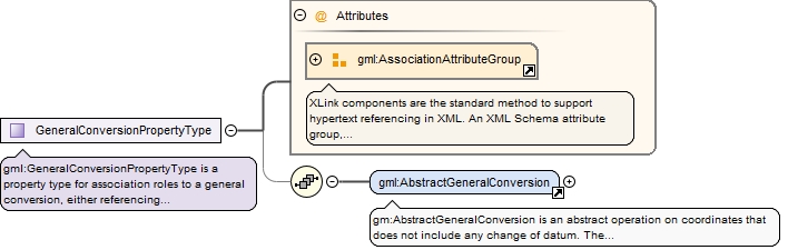 <complexType name="GeneralConversionPropertyType"><annotation><documentation>gml:GeneralConversionPropertyType is a property type for association roles to a general conversion, either referencing or containing the definition of that conversion.</documentation></annotation><sequence minOccurs="0"><element ref="gml:AbstractGeneralConversion"/></sequence><attributeGroup ref="gml:AssociationAttributeGroup"/></complexType>