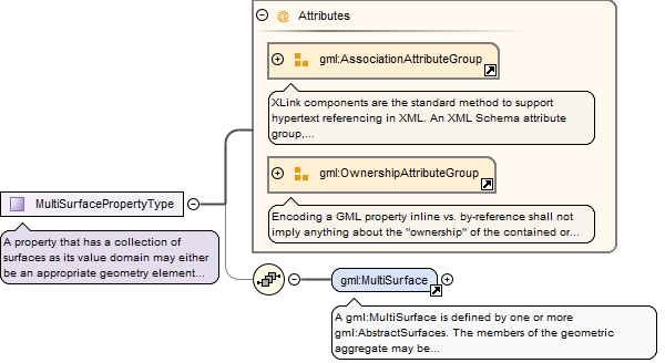 <complexType name="MultiSurfacePropertyType"><annotation><documentation>A property that has a collection of surfaces as its value domain may either be an appropriate geometry element encapsulated in an element of this type or an XLink reference to a remote geometry element (where remote includes geometry elements located elsewhere in the same document). Either the reference or the contained element shall be given, but neither both nor none.</documentation></annotation><sequence minOccurs="0"><element ref="gml:MultiSurface"/></sequence><attributeGroup ref="gml:AssociationAttributeGroup"/><attributeGroup ref="gml:OwnershipAttributeGroup"/></complexType>