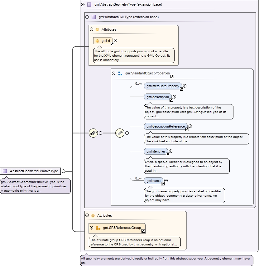 <complexType name="AbstractGeometryType" abstract="true"><annotation><documentation>All geometry elements are derived directly or indirectly from this abstract supertype. A geometry element may have an identifying attribute (gml:id), one or more names (elements identifier and name) and a description (elements description and descriptionReference) . It may be associated with a spatial reference system (attribute group gml:SRSReferenceGroup). The following rules shall be adhered to: - Every geometry type shall derive from this abstract type. - Every geometry element (i.e. an element of a geometry type) shall be directly or indirectly in the substitution group of AbstractGeometry.</documentation></annotation><complexContent><extension base="gml:AbstractGMLType"><attributeGroup ref="gml:SRSReferenceGroup"/></extension></complexContent></complexType>