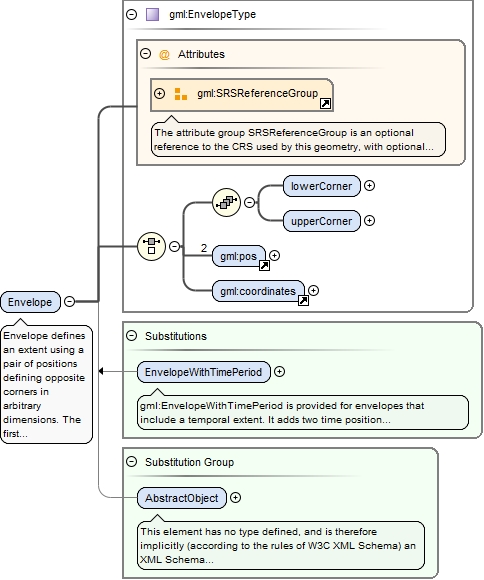 <element name="Envelope" type="gml:EnvelopeType" substitutionGroup="gml:AbstractObject"><annotation><documentation>Envelope defines an extent using a pair of positions defining opposite corners in arbitrary dimensions. The first direct position is the "lower corner" (a coordinate position consisting of all the minimal ordinates for each dimension for all points within the envelope), the second one the "upper corner" (a coordinate position consisting of all the maximal ordinates for each dimension for all points within the envelope). The use of the properties "coordinates" and "pos" has been deprecated. The explicitly named properties "lowerCorner" and "upperCorner" shall be used instead.</documentation></annotation></element>