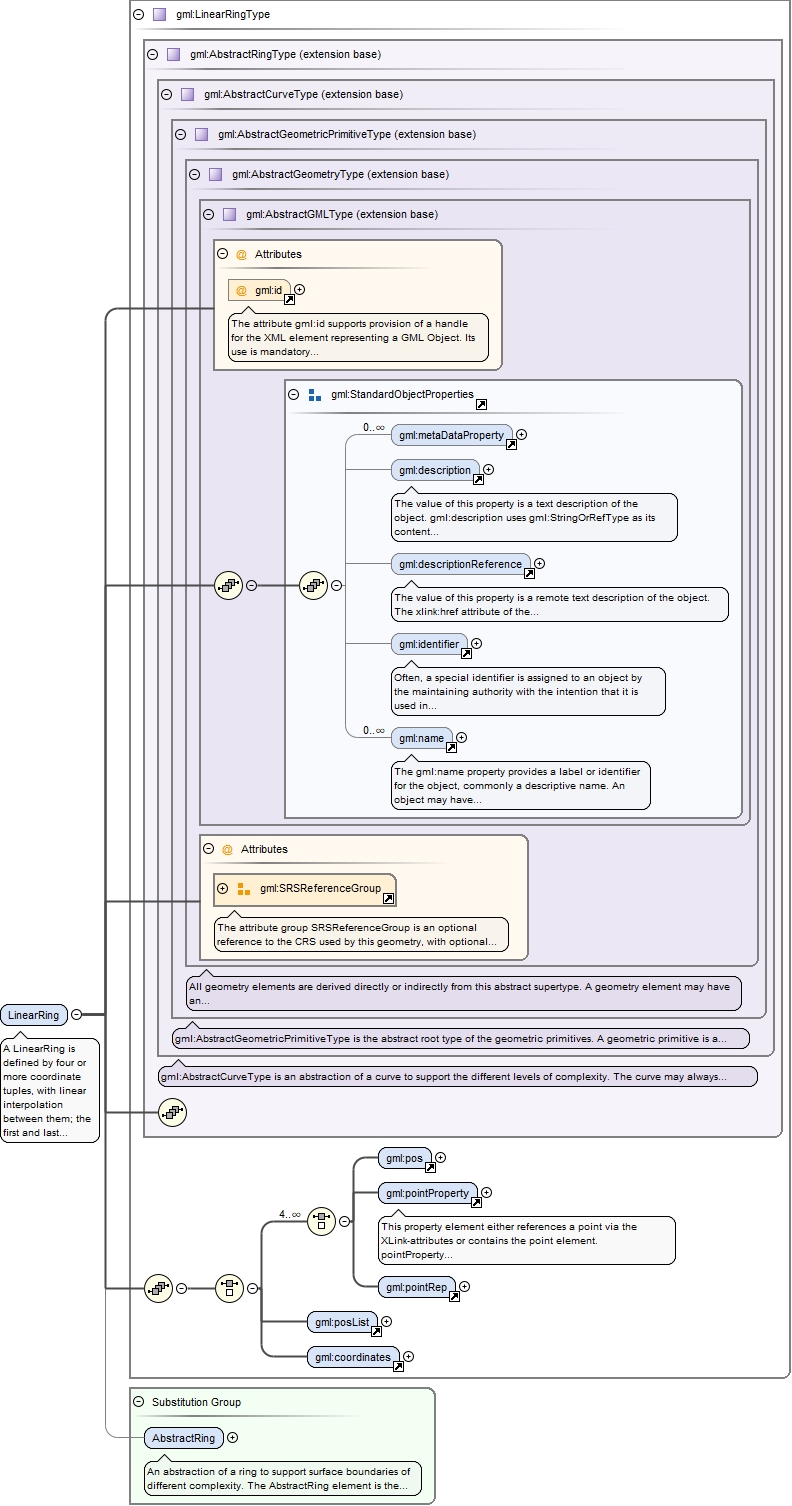 <element name="LinearRing" type="gml:LinearRingType" substitutionGroup="gml:AbstractRing"><annotation><documentation>A LinearRing is defined by four or more coordinate tuples, with linear interpolation between them; the first and last coordinates shall be coincident. The number of direct positions in the list shall be at least four.</documentation></annotation></element>
