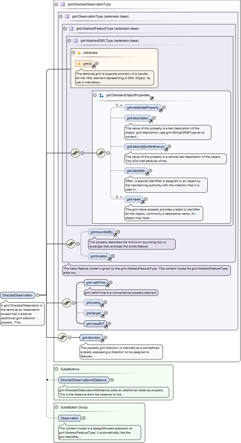 <element name="DirectedObservation" type="gml:DirectedObservationType" substitutionGroup="gml:Observation"><annotation><documentation>A gml:DirectedObservation is the same as an observation except that it adds an additional gml:direction property. This is the direction in which the observation was acquired. Clearly this applies only to certain types of observations such as visual observations by people, or observations obtained from terrestrial cameras.</documentation></annotation></element>