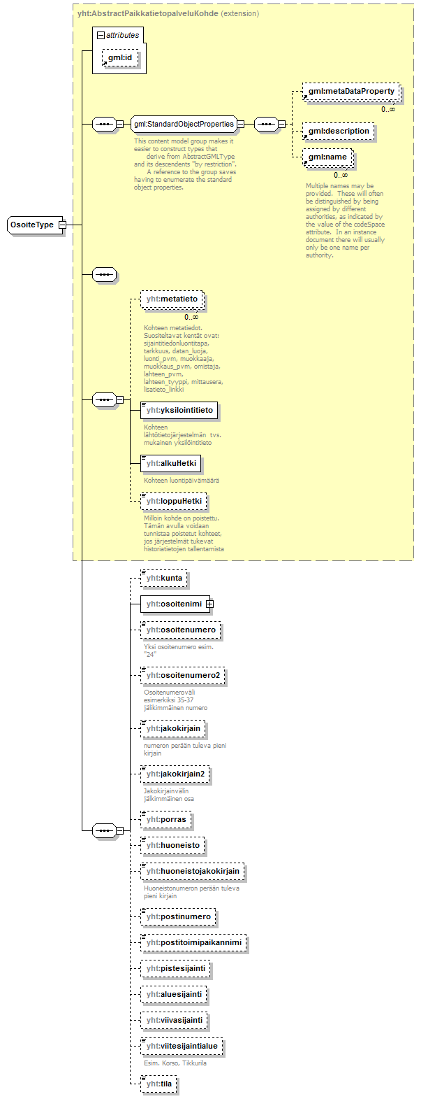 children gml:metaDataProperty gml:description gml:name yht:metatieto yht:yksilointitieto yht:alkuHetki yht:loppuHetki yht:kunta yht:osoitenimi yht:osoitenumero yht:osoitenumero2 yht:jakokirjain yht:jakokirjain2 yht:porras yht:huoneisto yht:huoneistojakokirjain yht:postinumero yht:postitoimipaikannimi yht:pistesijainti yht:aluesijainti yht:viivasijainti yht:viitesijaintialue yht:tila