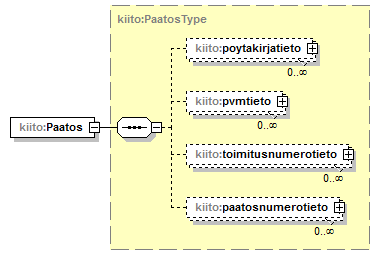 | source | <xs:element name="paatostieto" minOccurs="0" maxOccurs="unbounded"> <xs:complexType> <xs:sequence> <xs:element name="Paatos" type="kiito:PaatosType"/> </xs:sequence> </xs:complexType> </xs:element> |
