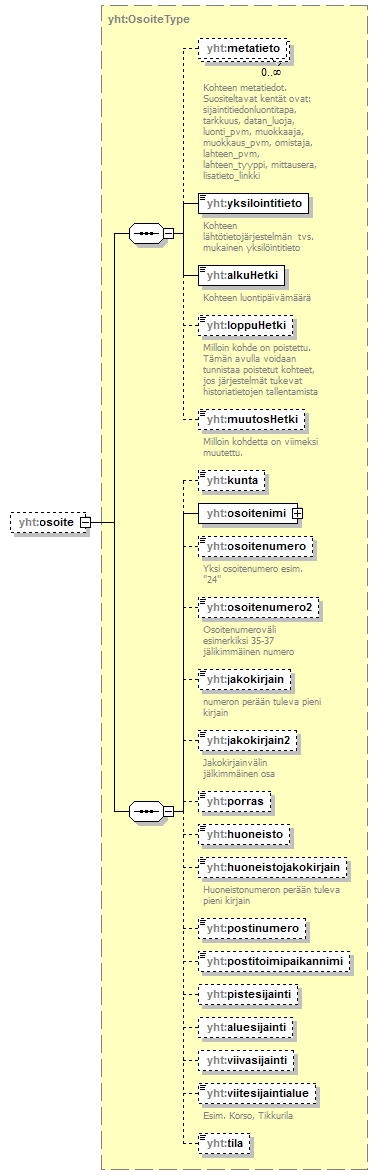 | children | yht:kunta yht:valtioSuomeksi yht:valtioKansainvalinen yht:osoitenimi yht:ulkomainenLahiosoite yht:osoitenumero yht:osoitenumero2 yht:jakokirjain yht:jakokirjain2 yht:porras yht:huoneisto yht:postinumero yht:postitoimipaikannimi yht:ulkomainenPostitoimipaikka yht:jarjestysnumero yht:pistesijainti yht:aluesijainti yht:viivasijainti | ||||