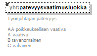 | source | <xs:simpleType name="PatevyysluokkaType"> <xs:annotation> <xs:documentation>Pätevyys: AA poikkeuksellisen vaativa A vaativa B tavanomainen C vähäinen</xs:documentation> </xs:annotation> <xs:restriction base="xs:string"> <xs:enumeration value="AA"/> <xs:enumeration value="A"/> <xs:enumeration value="B"/> <xs:enumeration value="C"/> <xs:enumeration value="ei tiedossa"/> </xs:restriction> </xs:simpleType> |