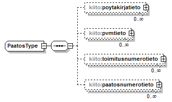 | source | <xs:element name="paatostieto" minOccurs="0" maxOccurs="unbounded"> <xs:complexType> <xs:sequence> <xs:element name="Paatos" type="kiito:PaatosType"/> </xs:sequence> </xs:complexType> </xs:element> |