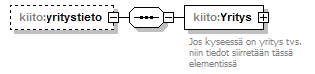| source | <xs:element name="yritystieto" minOccurs="0"> <xs:complexType> <xs:sequence> <xs:element name="Yritys" type="yht:YritysType"> <xs:annotation> <xs:documentation>Jos kyseessä on yritys tvs. niin tiedot siirretään tässä elementissä</xs:documentation> </xs:annotation> </xs:element> </xs:sequence> </xs:complexType> </xs:element> |