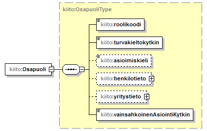 | source | <xs:element name="osapuolitieto" maxOccurs="unbounded"> <xs:complexType> <xs:sequence> <xs:element name="Osapuoli" type="kiito:OsapuoliType"/> </xs:sequence> </xs:complexType> </xs:element> |