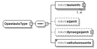 | source | <xs:complexType name="OpastauluType"> <xs:sequence> <xs:element name="tauluinfo" maxOccurs="unbounded"> <xs:complexType> <xs:sequence> <xs:element name="paikkakunta" maxOccurs="unbounded"/> <xs:element name="etaisyys" type="xs:string"/> <xs:element name="tienumero" maxOccurs="unbounded"/> <xs:element name="eurooppaTienumero" maxOccurs="unbounded"/> <xs:element name="nuolenSuunta"> <xs:simpleType> <xs:restriction base="xs:string"> <xs:enumeration value="1"/> <xs:enumeration value="2"/> <xs:enumeration value="3"/> <xs:enumeration value="4"/> <xs:enumeration value="5"/> <xs:enumeration value="6"/> <xs:enumeration value="7"/> <xs:enumeration value="8"/> </xs:restriction> </xs:simpleType> </xs:element> <xs:element name="vari"> <xs:simpleType> <xs:restriction base="xs:string"> <xs:enumeration value="1"/> <xs:enumeration value="2"/> <xs:enumeration value="3"/> </xs:restriction> </xs:simpleType> </xs:element> <xs:element name="etaisyysLiittymaan" type="xs:string"/> </xs:sequence> </xs:complexType> </xs:element> <xs:element name="sijainti" type="gml:PointPropertyType" minOccurs="0"/> <xs:element name="dynsegsijainti" type="mkvt:DynsegsijaintiType" minOccurs="0"/> <xs:element name="vaikutussuunta" type="mkvt:VaikutussuuntaType"/> </xs:sequence> </xs:complexType> |