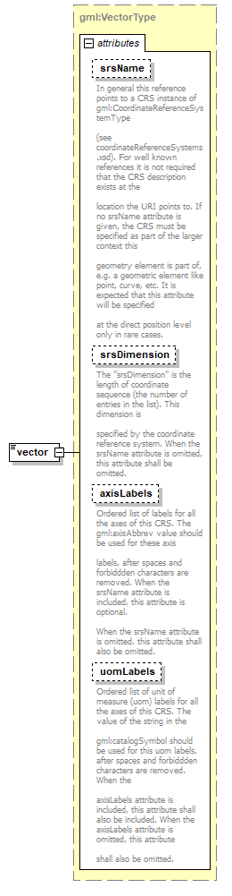 | Name | Type | Use | Default | Fixed | annotation | | srsName | xs:anyURI | optional | | | | documentation | In general this reference points to a CRS instance of gml:CoordinateReferenceSystemType