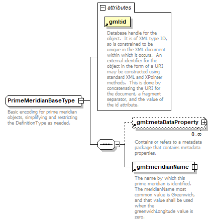 | source | <xs:complexType name="PrimeMeridianBaseType" abstract="true"> <xs:annotation> <xs:documentation>Basic encoding for prime meridian objects, simplifying and restricting the DefinitionType as needed. </xs:documentation> </xs:annotation> <xs:complexContent> <xs:restriction base="gml:DefinitionType"> <xs:sequence> <xs:element ref="gml:metaDataProperty" minOccurs="0" maxOccurs="unbounded"/> <xs:element ref="gml:meridianName"/> </xs:sequence> <xs:attribute ref="gml:id" use="required"/> </xs:restriction> </xs:complexContent> </xs:complexType> |