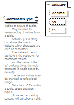 | source | <xs:complexType name="CoordinatesType"> <xs:annotation> <xs:documentation>Tables or arrays of tuples. May be used for text-encoding of values from a table. Actually just a string, but allows the user to indicate which characters are used as separators. The value of the 'cs' attribute is the separator for coordinate values, and the value of the 'ts' attribute gives the tuple separator (a single space by default); the default values may be changed to reflect local usage. Defaults to CSV within a tuple, space between tuples. However, any string content will be schema-valid. </xs:documentation> </xs:annotation> <xs:simpleContent> <xs:extension base="string"> <xs:attribute name="decimal" type="string" default="."/> <xs:attribute name="cs" type="string" default=","/> <xs:attribute name="ts" type="string" default=" "/> </xs:extension> </xs:simpleContent> </xs:complexType> |