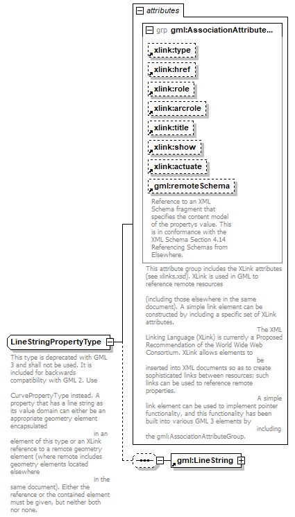 | source | <xs:complexType name="LineStringPropertyType"> <xs:annotation> <xs:documentation>This type is deprecated with GML 3 and shall not be used. It is included for backwards compatibility with GML 2. Use CurvePropertyType instead. A property that has a line string as its value domain can either be an appropriate geometry element encapsulated in an element of this type or an XLink reference to a remote geometry element (where remote includes geometry elements located elsewhere in the same document). Either the reference or the contained element must be given, but neither both nor none.</xs:documentation> </xs:annotation> <xs:sequence minOccurs="0"> <xs:element ref="gml:LineString"/> </xs:sequence> <xs:attributeGroup ref="gml:AssociationAttributeGroup"> <xs:annotation> <xs:documentation>This attribute group includes the XLink attributes (see xlinks.xsd). XLink is used in GML to reference remote resources (including those elsewhere in the same document). A simple link element can be constructed by including a specific set of XLink attributes. The XML Linking Language (XLink) is currently a Proposed Recommendation of the World Wide Web Consortium. XLink allows elements to be inserted into XML documents so as to create sophisticated links between resources; such links can be used to reference remote properties. A simple link element can be used to implement pointer functionality, and this functionality has been built into various GML 3 elements by including the gml:AssociationAttributeGroup.</xs:documentation> </xs:annotation> </xs:attributeGroup> </xs:complexType> |
