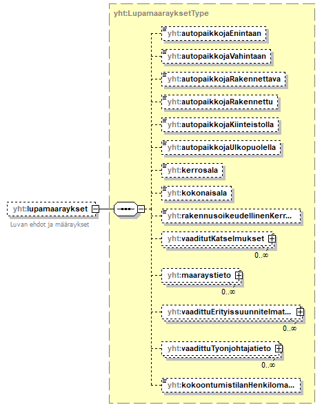 | children | yht:autopaikkojaEnintaan yht:autopaikkojaVahintaan yht:autopaikkojaRakennettava yht:autopaikkojaRakennettu yht:autopaikkojaKiinteistolla yht:autopaikkojaUlkopuolella yht:kerrosala yht:kokonaisala yht:rakennusoikeudellinenKerrosala yht:vaaditutKatselmukset yht:maaraystieto yht:vaadittuErityissuunnitelmatieto yht:vaadittuTyonjohtajatieto yht:kokoontumistilanHenkilomaara | ||||||||