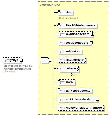 | source | <xs:element name="yritys" type="yht:YritysType" minOccurs="0"> <xs:annotation> <xs:documentation>Jos kyseessä on yritys tvs. niin tiedot siirretään tässä elementissä</xs:documentation> </xs:annotation> </xs:element> |