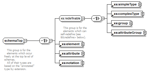 | source | <xs:group name="schemaTop"> <xs:annotation> <xs:documentation> This group is for the elements which occur freely at the top level of schemas. All of their types are based on the "annotated" type by extension.</xs:documentation> </xs:annotation> <xs:choice> <xs:group ref="xs:redefinable"/> <xs:element ref="xs:element"/> <xs:element ref="xs:attribute"/> <xs:element ref="xs:notation"/> </xs:choice> </xs:group> |