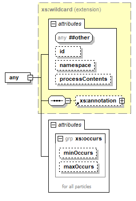 | source | <xs:element name="any" id="any"> <xs:annotation> <xs:documentation source="http://www.w3.org/TR/xmlschema-1/#element-any"/> </xs:annotation> <xs:complexType> <xs:complexContent> <xs:extension base="xs:wildcard"> <xs:attributeGroup ref="xs:occurs"/> </xs:extension> </xs:complexContent> </xs:complexType> </xs:element> |