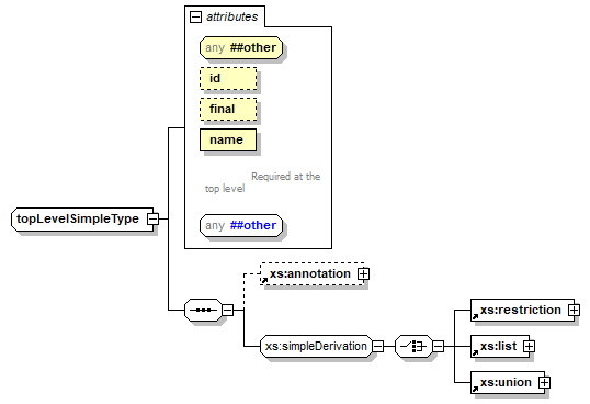 | source | <xs:complexType name="topLevelSimpleType"> <xs:complexContent> <xs:restriction base="xs:simpleType"> <xs:sequence> <xs:element ref="xs:annotation" minOccurs="0"/> <xs:group ref="xs:simpleDerivation"/> </xs:sequence> <xs:attribute name="name" type="xs:NCName" use="required"> <xs:annotation> <xs:documentation> Required at the top level </xs:documentation> </xs:annotation> </xs:attribute> <xs:anyAttribute namespace="##other" processContents="lax"/> </xs:restriction> </xs:complexContent> </xs:complexType> |