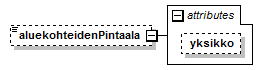 | source | <xs:element name="aluekohteidenPintaala" minOccurs="0"> <xs:complexType> <xs:simpleContent> <xs:extension base="xs:double"> <xs:attribute name="yksikko" fixed="m^2"/> </xs:extension> </xs:simpleContent> </xs:complexType> </xs:element> |