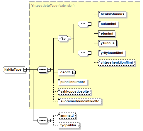 | source | <xs:complexType name="YhteystietoType"> <xs:sequence> <xs:choice> <xs:sequence> <xs:element name="henkilotunnus" type="xs:string"/> <xs:element name="sukunimi" type="xs:string"/> <xs:element name="etunimi" type="xs:string"/> </xs:sequence> <xs:sequence> <xs:element name="yTunnus" type="xs:string"/> <xs:element name="yrityksenNimi" type="xs:string"/> <xs:element name="yhteyshenkilonNimi" type="xs:string" minOccurs="0"/> </xs:sequence> </xs:choice> <xs:element name="osoite" type="OsoiteType"/> <xs:element name="puhelinnumero" type="xs:string"/> <xs:element name="sahkopostiosoite" type="xs:string" minOccurs="0"/> <xs:element name="suoramarkkinointikielto" type="xs:boolean" minOccurs="0"/> </xs:sequence> </xs:complexType> |
