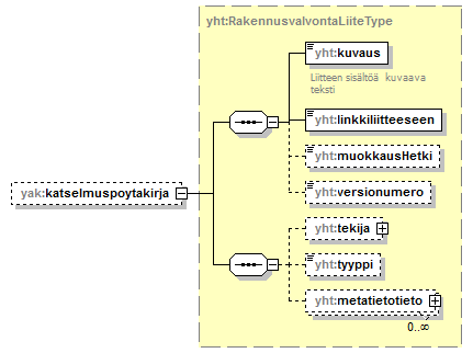 | source | <xs:element name="merkinnatJaPiirroksettieto" minOccurs="0" maxOccurs="unbounded"> <xs:complexType> <xs:sequence> <xs:element ref="yak:Merkinta"/> </xs:sequence> </xs:complexType> </xs:element> |