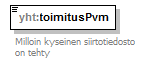 | source | <xs:element name="toimitusPvm" type="xs:date"> <xs:annotation> <xs:documentation>Milloin kyseinen siirtotiedosto on tehty</xs:documentation> </xs:annotation> </xs:element> |