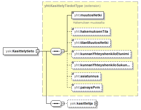 | source | <xs:element name="Kasittelytieto"> <xs:complexType> <xs:complexContent> <xs:extension base="yht:KasittelyTiedotType"> <xs:sequence> <xs:element name="kasittelija" type="yak:YleisenAlueenOsapuoliType" minOccurs="0"/> </xs:sequence> </xs:extension> </xs:complexContent> </xs:complexType> </xs:element> |