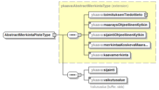 | source | <xs:complexType name="AbstractMerkintaPisteType" abstract="true"> <xs:complexContent> <xs:extension base="ykaava:AbstractMerkintaType"> <xs:sequence> <xs:element name="sijainti" type="gml:PointPropertyType"/> <xs:element name="vaikutusalue" type="xs:double"> <xs:annotation> <xs:documentation>Vaikutusalue (buffer, säde)</xs:documentation> </xs:annotation> </xs:element> </xs:sequence> </xs:extension> </xs:complexContent> </xs:complexType> |