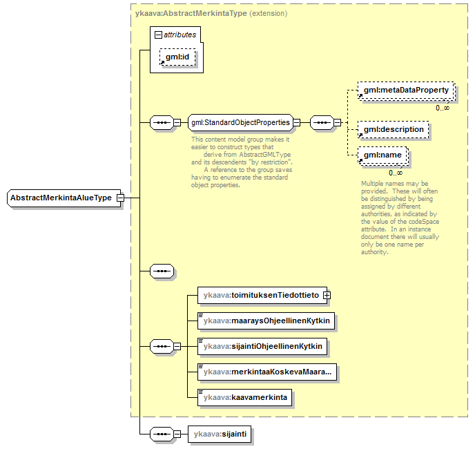 | children | gml:metaDataProperty gml:description gml:name ykaava:toimituksenTiedottieto ykaava:maaraysOhjeellinenKytkin ykaava:sijaintiOhjeellinenKytkin ykaava:merkintaaKoskevaMaarays ykaava:kaavamerkinta ykaava:sijainti | ||||||||||||