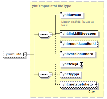 | source | <xs:element name="liitetieto" minOccurs="0"> <xs:complexType> <xs:sequence> <xs:element name="Liite" type="yht:YmparistoLiiteType"/> </xs:sequence> </xs:complexType> </xs:element> |