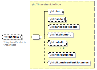 | children | yht:henkilotunnus yht:ulkomainenHenkilotunnus yht:sukunimi yht:etunimi yht:yTunnus yht:yrityksenNimi yht:yhteyshenkilonNimi yht:osoitetieto yht:puhelinnumero yht:sahkopostiosoite yht:suoramarkkinointikielto yht:verkkolaskutustieto yht:laskuviite | ||||||||