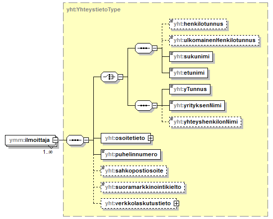| children | yht:henkilotunnus yht:ulkomainenHenkilotunnus yht:sukunimi yht:etunimi yht:yTunnus yht:yrityksenNimi yht:yhteyshenkilonNimi yht:osoitetieto yht:puhelinnumero yht:sahkopostiosoite yht:suoramarkkinointikielto yht:verkkolaskutustieto | ||||||||