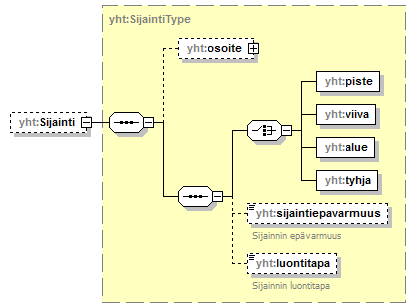 | source | <xs:complexType name="ToiminnanSijaintiType"> <xs:sequence> <xs:element name="osoite" type="yht:PostiosoiteType"/> <xs:element name="kunta" type="xs:string"/> <xs:element name="sijainti" type="gml:PointPropertyType"/> <xs:element name="liite" type="yht:YmparistoLiiteType" minOccurs="0"/> <xs:element name="kiinteistorekisterinumero" type="xs:string" minOccurs="0" maxOccurs="unbounded"/> </xs:sequence> </xs:complexType> |