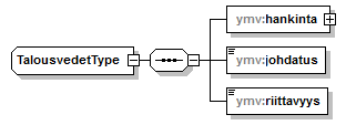 | source | <xs:complexType name="TalousvedetType"> <xs:sequence> <xs:element name="hankinta"> <xs:complexType> <xs:choice> <xs:element name="muu" type="xs:string"> <xs:annotation> <xs:documentation>Muu, mikä?</xs:documentation> </xs:annotation> </xs:element> <xs:element name="hankinta" type="ymv:hankintaType"/> </xs:choice> </xs:complexType> </xs:element> <xs:element name="johdatus" type="ymv:johdatusType"/> <xs:element name="riittavyys" type="ymv:riittavyysType"/> </xs:sequence> </xs:complexType> |