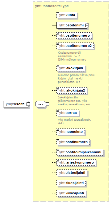 | source | <xs:element name="osoitetieto"> <xs:complexType> <xs:sequence> <xs:element name="Osoite" type="yht:PostiosoiteType"/> </xs:sequence> </xs:complexType> </xs:element> |