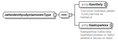 | source | <xs:complexType name="JatteidenHyodyntaminenType"> <xs:sequence> <xs:element name="Kasittely" type="ymy:KasittelyType"> <xs:annotation> <xs:documentation>Toiiminnan koskiessa jätteen hyödyntämistä tai käsittelyä </xs:documentation> </xs:annotation> </xs:element> <xs:element name="Kaatopaikka" type="ymy:KaatopaikkaType"> <xs:annotation> <xs:documentation>Kaatopaikkaa koskevassa lupahakemuksessa on lisäksi esitettävä seuraavat tiedot</xs:documentation> </xs:annotation> </xs:element> </xs:sequence> </xs:complexType> |