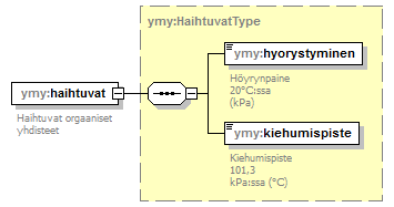| source | <xs:complexType name="HaihtuvatType"> <xs:sequence> <xs:element name="hyorystyminen" type="xs:string"> <xs:annotation> <xs:documentation>Höyrynpaine 20°C:ssa (kPa)</xs:documentation> </xs:annotation> </xs:element> <xs:element name="kiehumispiste" type="xs:string"> <xs:annotation> <xs:documentation>Kiehumispiste 101,3 kPa:ssa (°C)</xs:documentation> </xs:annotation> </xs:element> </xs:sequence> </xs:complexType> |