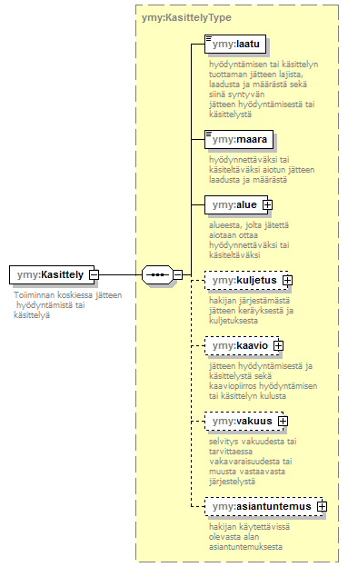| source | <xs:element name="Kasittely" type="ymy:KasittelyType"> <xs:annotation> <xs:documentation>Toiiminnan koskiessa jätteen hyödyntämistä tai käsittelyä </xs:documentation> </xs:annotation> </xs:element> |