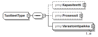 | source | <xs:complexType name="TuotteetType"> <xs:sequence> <xs:element name="Kapasiteetti" type="ymy:KapasiteettiType" minOccurs="0"/> <xs:element name="Prosessit" type="ymy:ProsessitType" minOccurs="0"/> <xs:element name="Varastointipaikka" type="ymy:VarastointipaikkaType" maxOccurs="unbounded"/> </xs:sequence> </xs:complexType> |