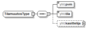| source | <xs:complexType name="TilamuutosType"> <xs:sequence> <xs:element name="pvm" type="xs:date"/> <xs:element name="tila" type="yht:MuutosTilaType"/> <xs:element name="kasittelija" type="yht:OsapuoliType" minOccurs="0"/> </xs:sequence> </xs:complexType> |
