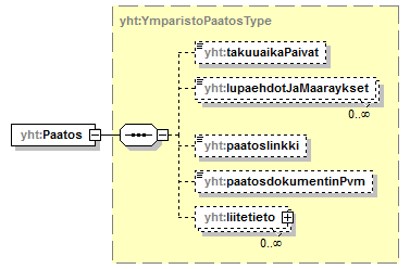 | source | <xs:complexType name="YmparistoPaatosType"> <xs:sequence> <xs:element name="takuuaikaPaivat" type="xs:int" minOccurs="0"/> <xs:element name="lupaehdotJaMaaraykset" type="xs:string" minOccurs="0" maxOccurs="unbounded"/> <xs:element name="paatoslinkki" type="xs:string" minOccurs="0"/> <xs:element name="paatosdokumentinPvm" type="xs:date" minOccurs="0"/> <xs:element name="liitetieto" minOccurs="0" maxOccurs="unbounded"> <xs:complexType> <xs:sequence> <xs:element name="Liite" type="yht:YmparistoLiiteType"/> </xs:sequence> </xs:complexType> </xs:element> </xs:sequence> </xs:complexType> |