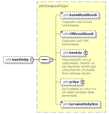 | source | <xs:complexType name="YmparistoOsapuoliType"> <xs:sequence> <xs:element name="henkilo" type="yht:YhteyshenkiloType" minOccurs="0"> <xs:annotation> <xs:documentation>Yhteyshenkilön nimi ja yhteystiedot</xs:documentation> </xs:annotation> </xs:element> <xs:element name="yritys" type="yht:YritysType" minOccurs="0"> <xs:annotation> <xs:documentation>Jos kyseessä on yritys tvs. niin tiedot siirretään tässä elementissä</xs:documentation> </xs:annotation> </xs:element> <xs:element name="turvakieltoKytkin" type="xs:boolean" minOccurs="0"/> <xs:element name="suoramarkkinointikieltoKytkin" type="xs:boolean" minOccurs="0"/> <xs:element name="rooliKoodi" minOccurs="0"> <xs:simpleType> <xs:restriction base="xs:string"> <xs:enumeration value="vireillepanija"/> <xs:enumeration value="toiminnanharjoittaja"/> <xs:enumeration value="entinen toiminnanharjoittaja"/> <xs:enumeration value="maksaja"/> <xs:enumeration value="asiamies"/> <xs:enumeration value="muu"/> <xs:enumeration value="ei tiedossa"/> </xs:restriction> </xs:simpleType> </xs:element> </xs:sequence> </xs:complexType> |