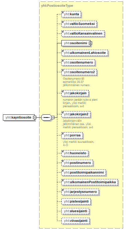 | children | yht:kunta yht:valtioSuomeksi yht:valtioKansainvalinen yht:osoitenimi yht:ulkomainenLahiosoite yht:osoitenumero yht:osoitenumero2 yht:jakokirjain yht:jakokirjain2 yht:porras yht:huoneisto yht:postinumero yht:postitoimipaikannimi yht:ulkomainenPostitoimipaikka yht:jarjestysnumero yht:pistesijainti yht:aluesijainti yht:viivasijainti | ||||